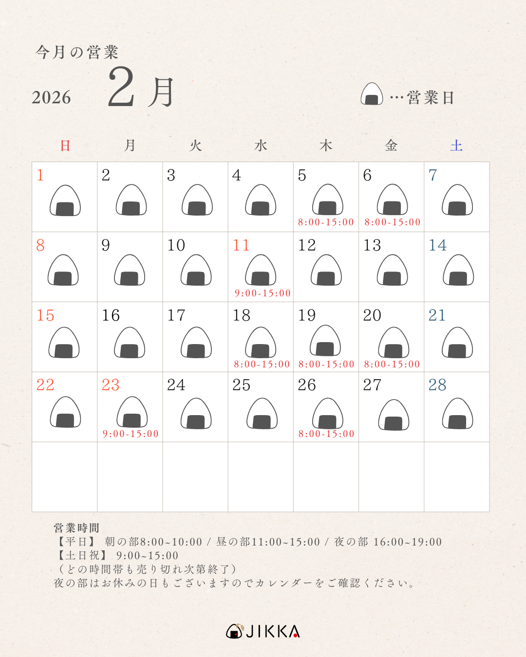 | 営業時間 | 不定休 平日 朝の部 7:00-10:00昼の部 11:00-15:00夜の部 16:00-19:00 土日祝 9:00-15:00 (どの時間帯も予定数がなくなり次第終了) |